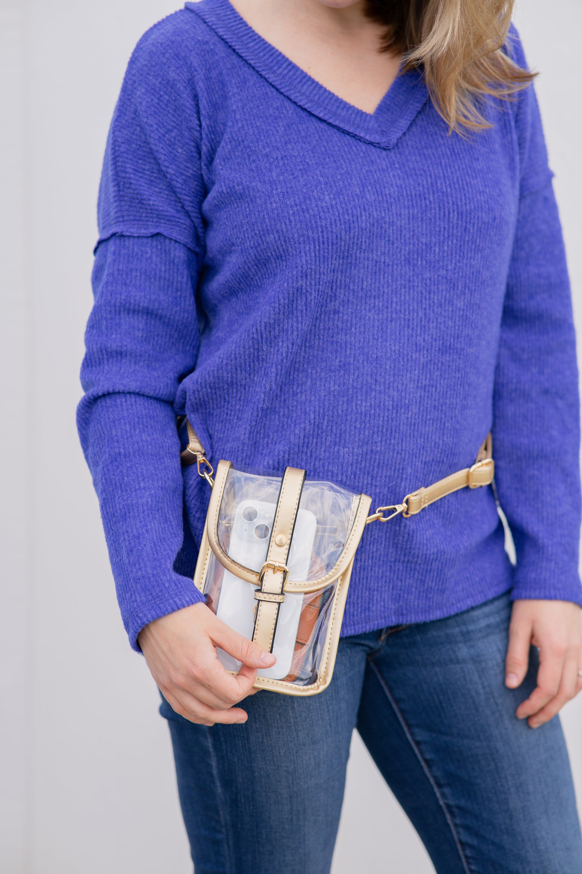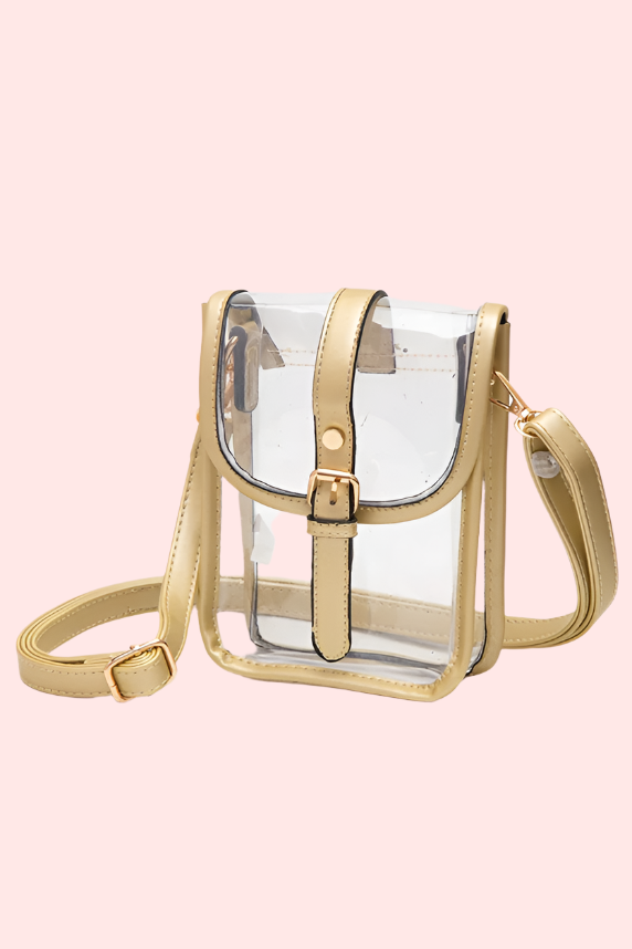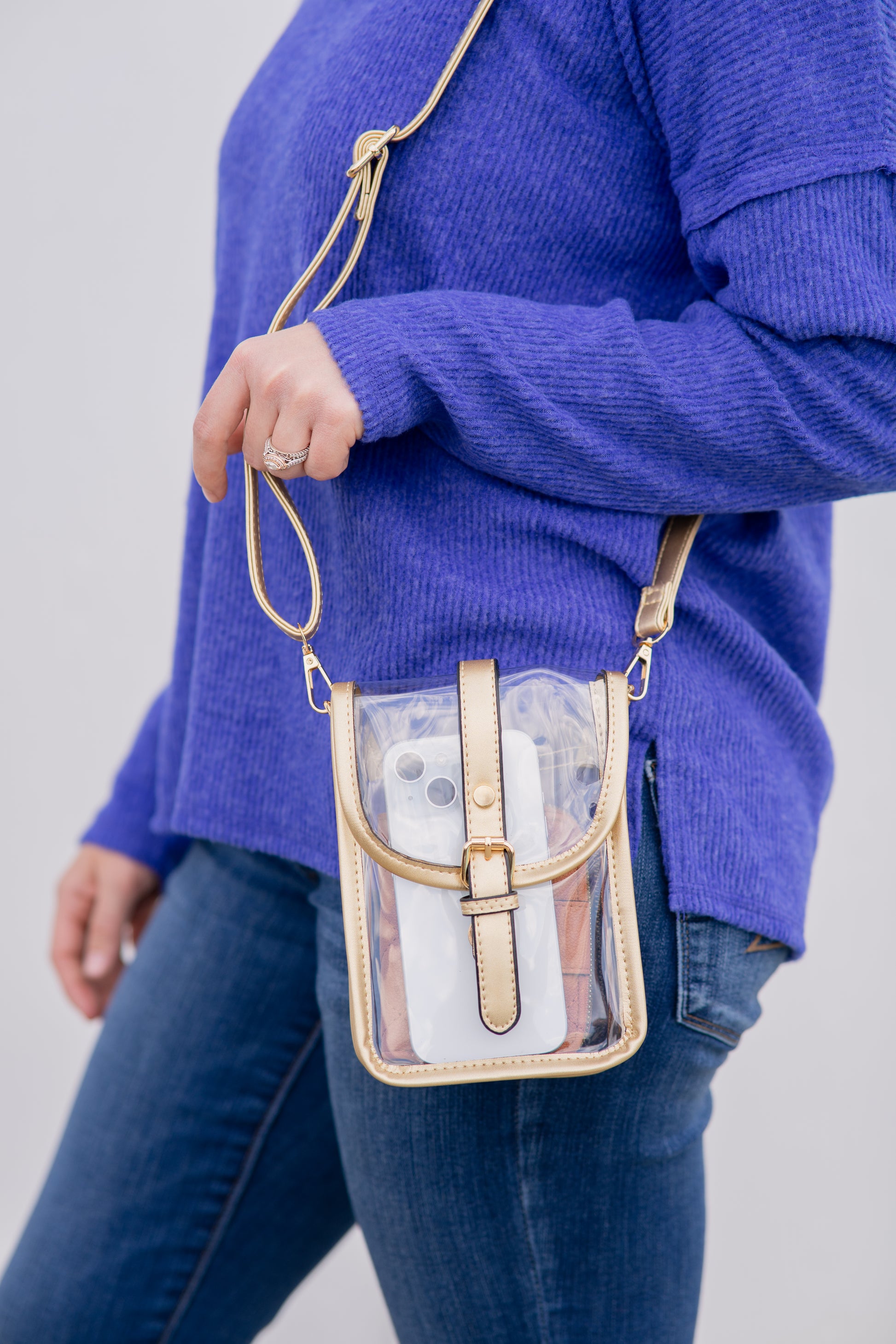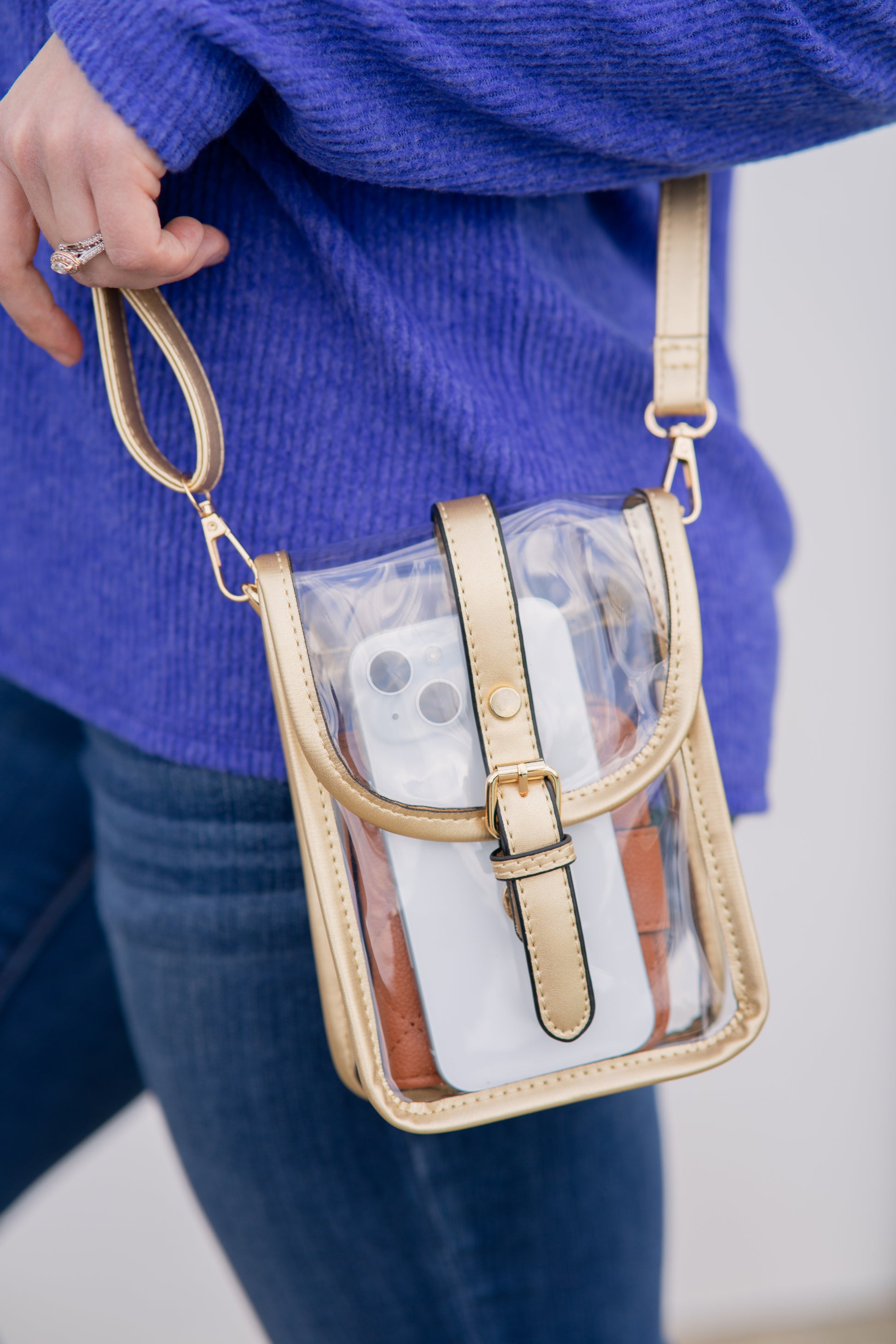 You'll have the All Clear Access to your ball game, concert or show with this stadium security approved bag! Perfect to hold your keys, cards, lipstick, larger cell phones (with covers) and more! Snap closure, adorable front buckle design, fully trimmed and adjustable to be worn as a belt bag, shoulder bag or crossbody - THREE in one styling options! 7" H x 5" W x 2" D - Strap Drop 24" to 50"