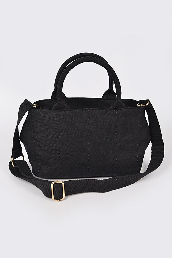 Features: Solid canvas construction for everyday durability - Gold hardware for an elevated touch - Top handle design + removable strap for 3-in-1 versatility - Zippered top closure and interior zip pocket - Metal feet to protect the base and maintain structure - Dimensions: 11.5” W x 7.5” H x 6” D