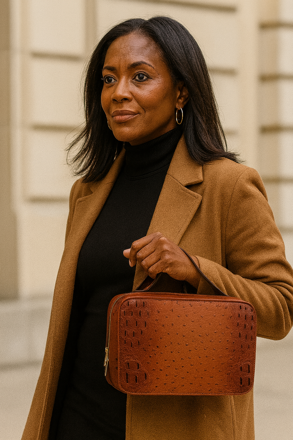 The Bible is often called the "Good News" so we felt that was the perfect name for this beautiful carrier. All vegan leather ostrich material, fully lined with interior elastic straps for security and even a pen loop. Single carry top handle, gold hardware and zip closure. Approximate Size: 11L x 8.25H x 3.75W