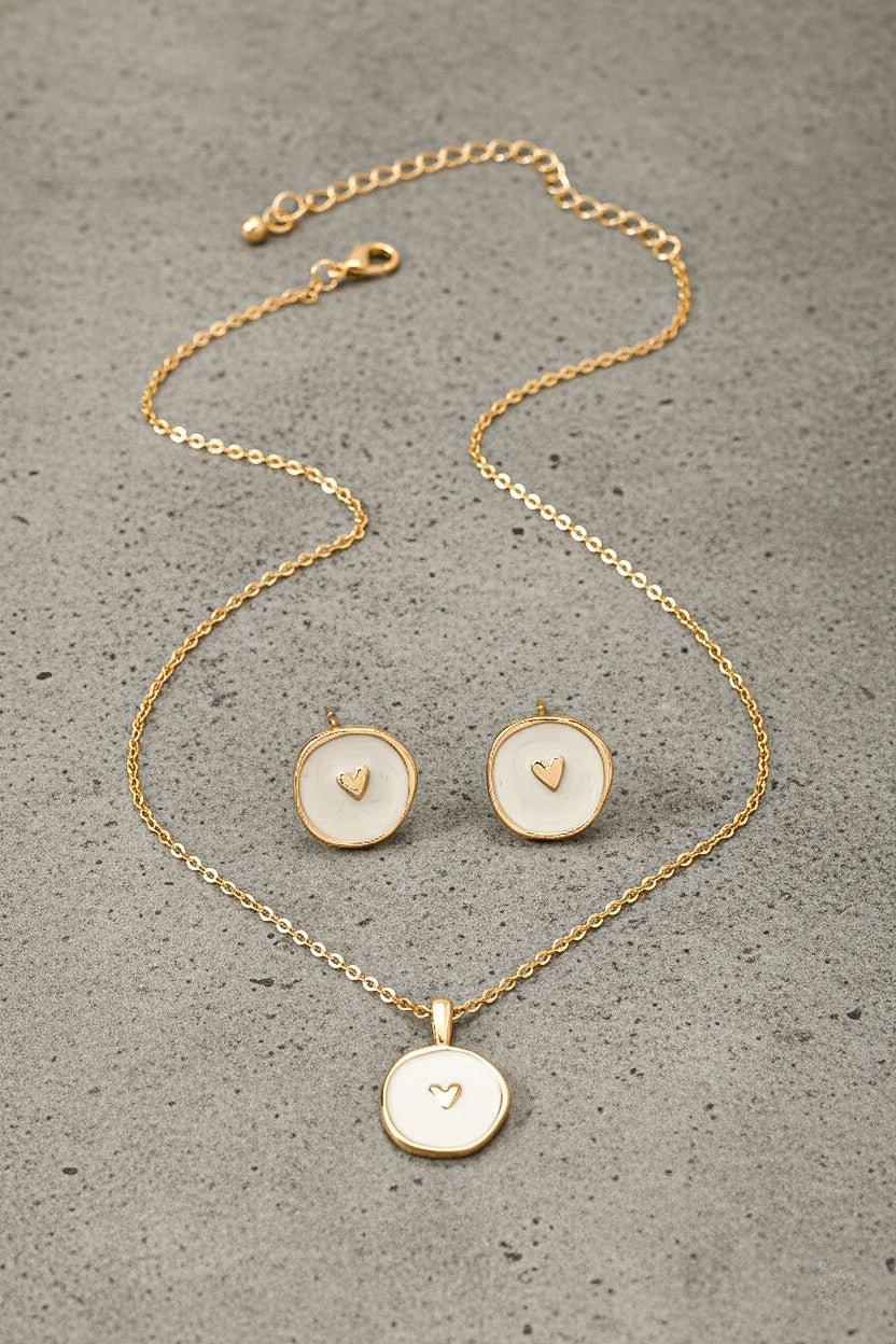 Sweet, stylish, and made to mean something—the Heart to Heart Set is a modern love note you can wear. Featuring an embossed heart coin framed in glossy enamel, this matching necklace and earring set blends soft romance with everyday polish.