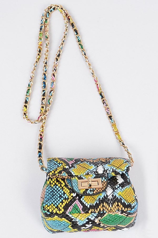 When you need that "just enough" purse for your night out. Compact, keys, lipstick, money/cards and ID...the Magnificent Mini Statement Purse is your GIRL! In a fun textured and vibrant multi-colored snake skin print she will be the POP against that "little black dress". Gold hardware, twist lock front clasp, chain and material long shoulder or crossbody strap. She packs a punch for her small but mighty size - 5"W X 3"H X 2"D
