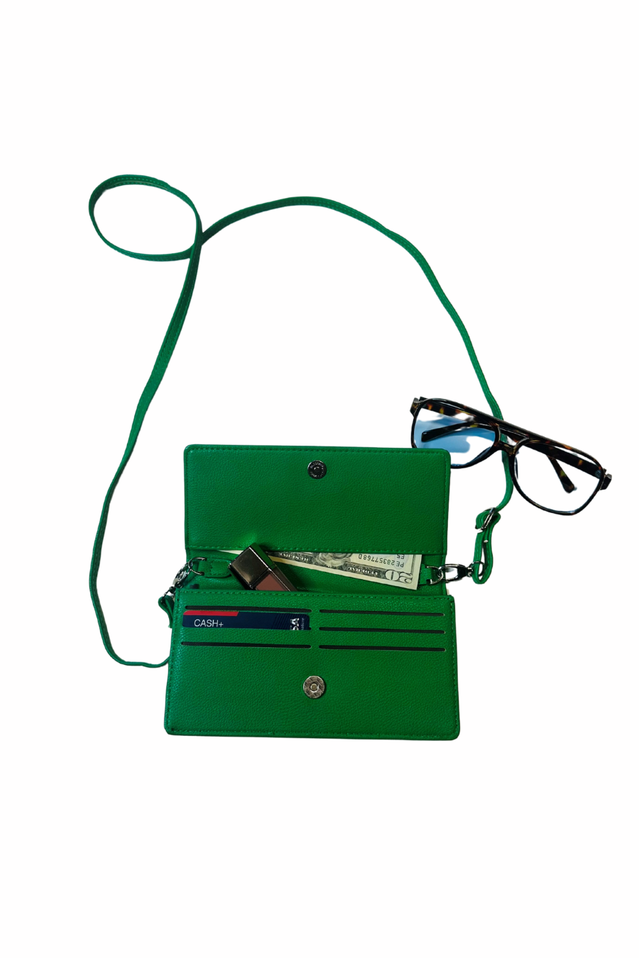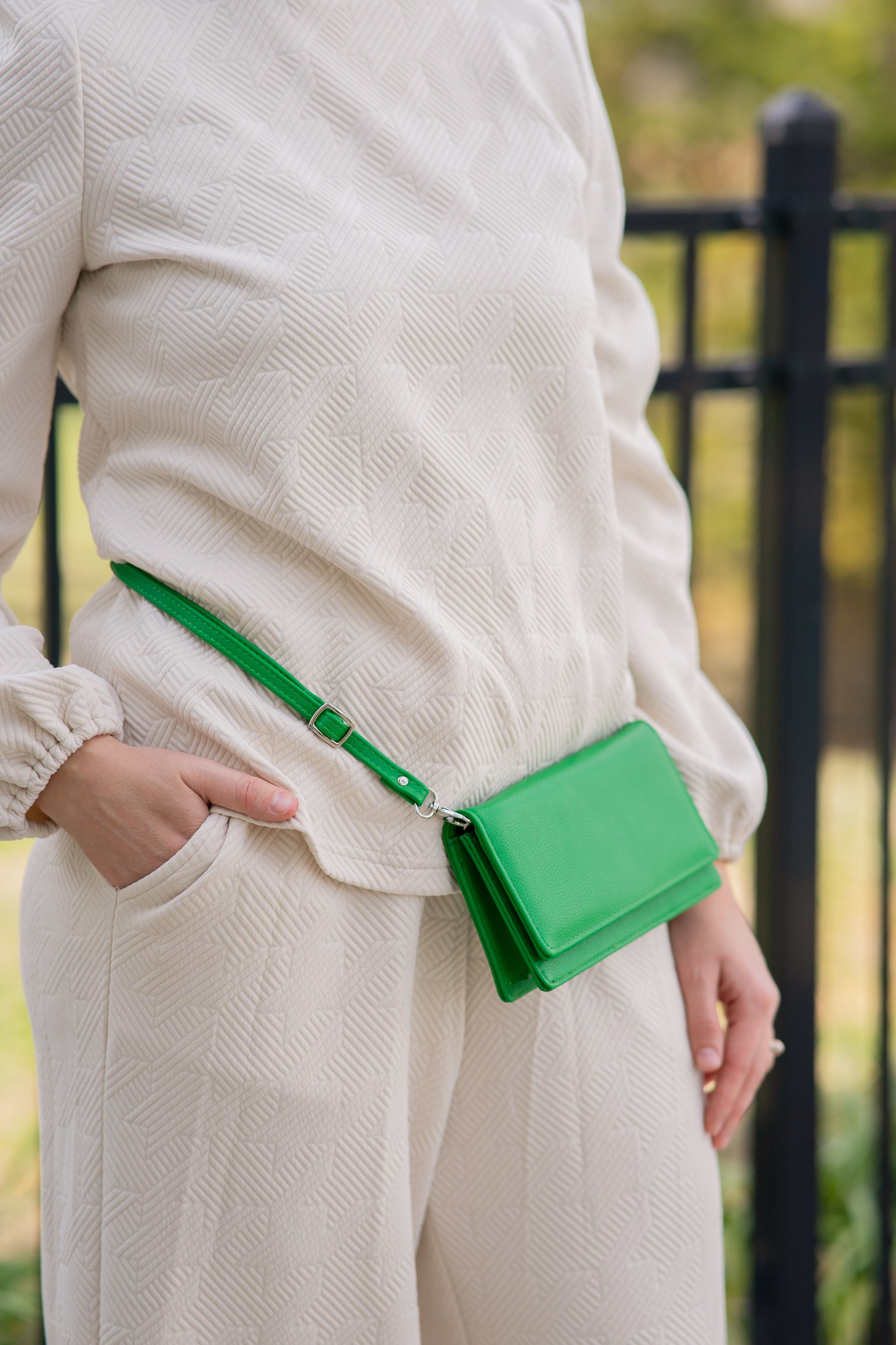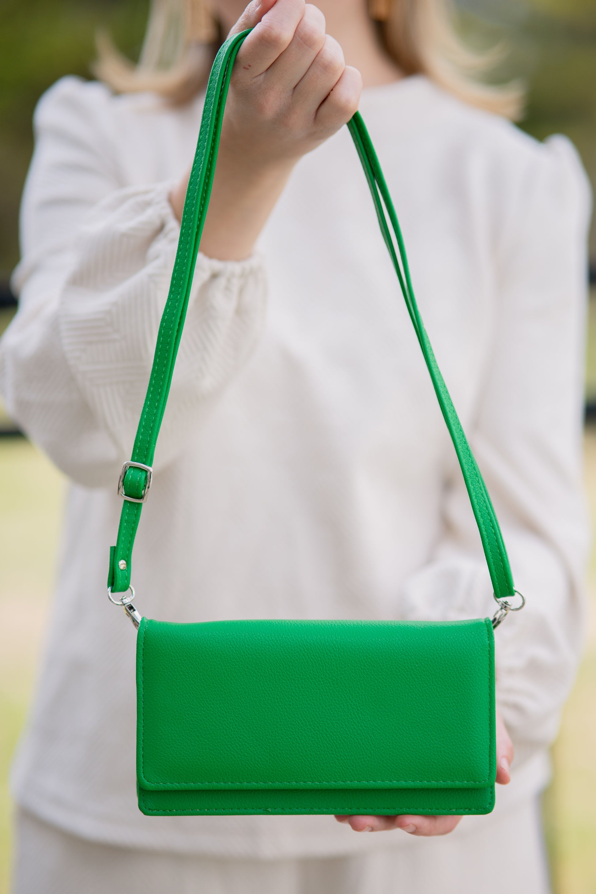 NOTHING says "power move" like a emerald green bag! She's a wallet, a clutch, a crossbody and about to be your BFF all Spring & Summer! Adjustable and removeable strap takes her from shoulder bag to crossbody to waist bag with the slide of the buckle. She's easy, she's helpful and she's powerful! Measures: 7.5W X 4H X 1.25D.