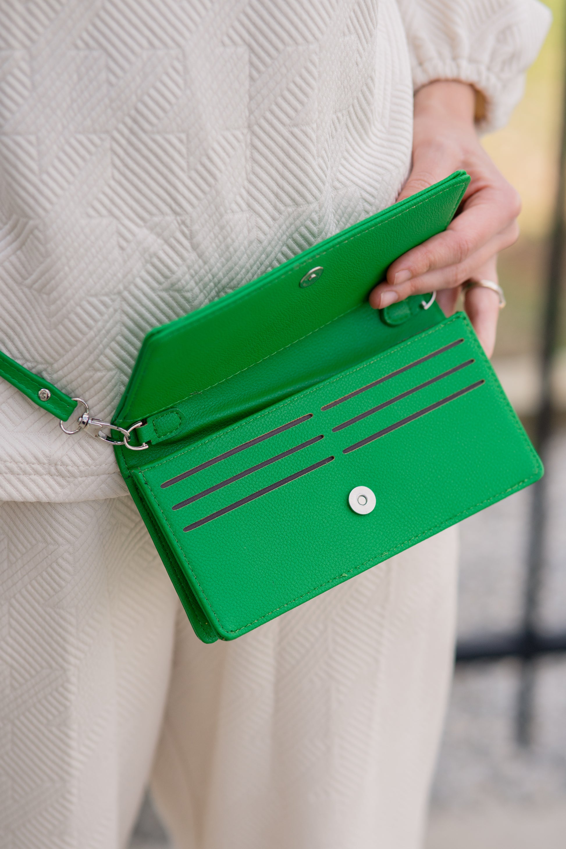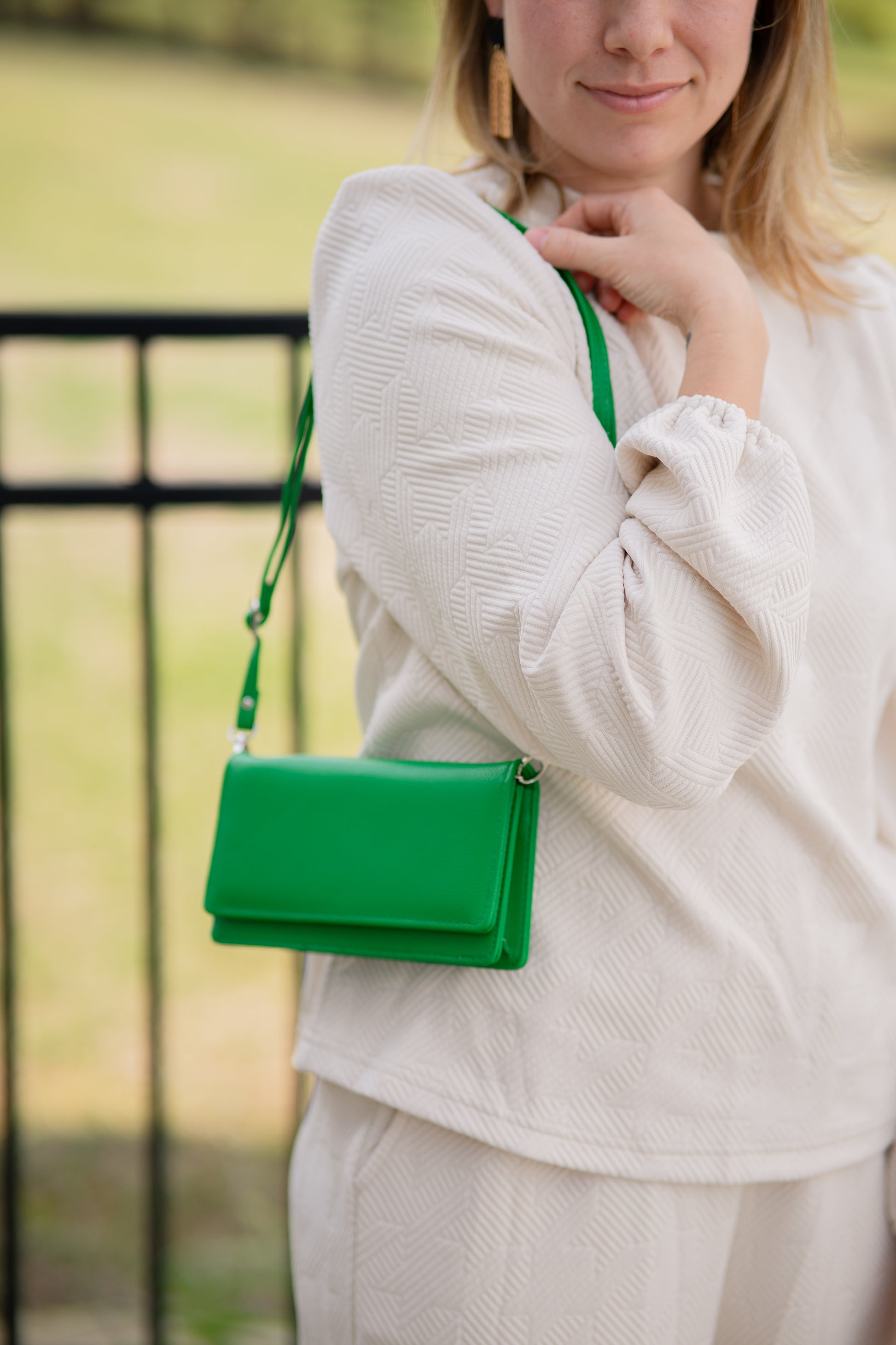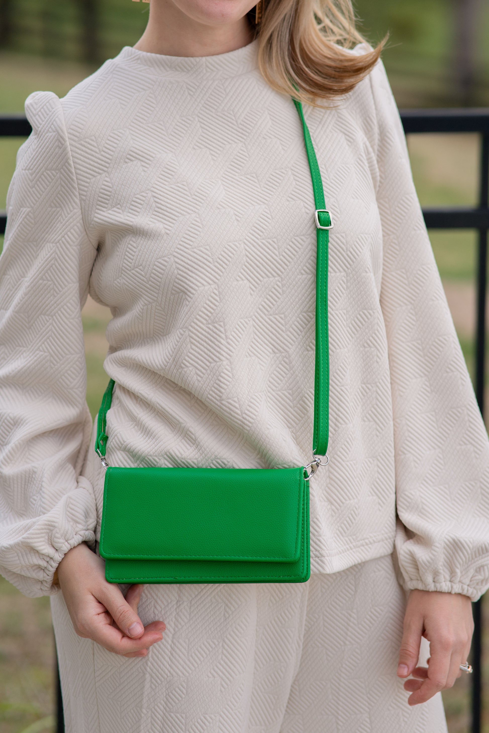 NOTHING says "power move" like a emerald green bag! She's a wallet, a clutch, a crossbody and about to be your BFF all Spring & Summer! Adjustable and removeable strap takes her from shoulder bag to crossbody to waist bag with the slide of the buckle. She's easy, she's helpful and she's powerful! Measures: 7.5W X 4H X 1.25D.
