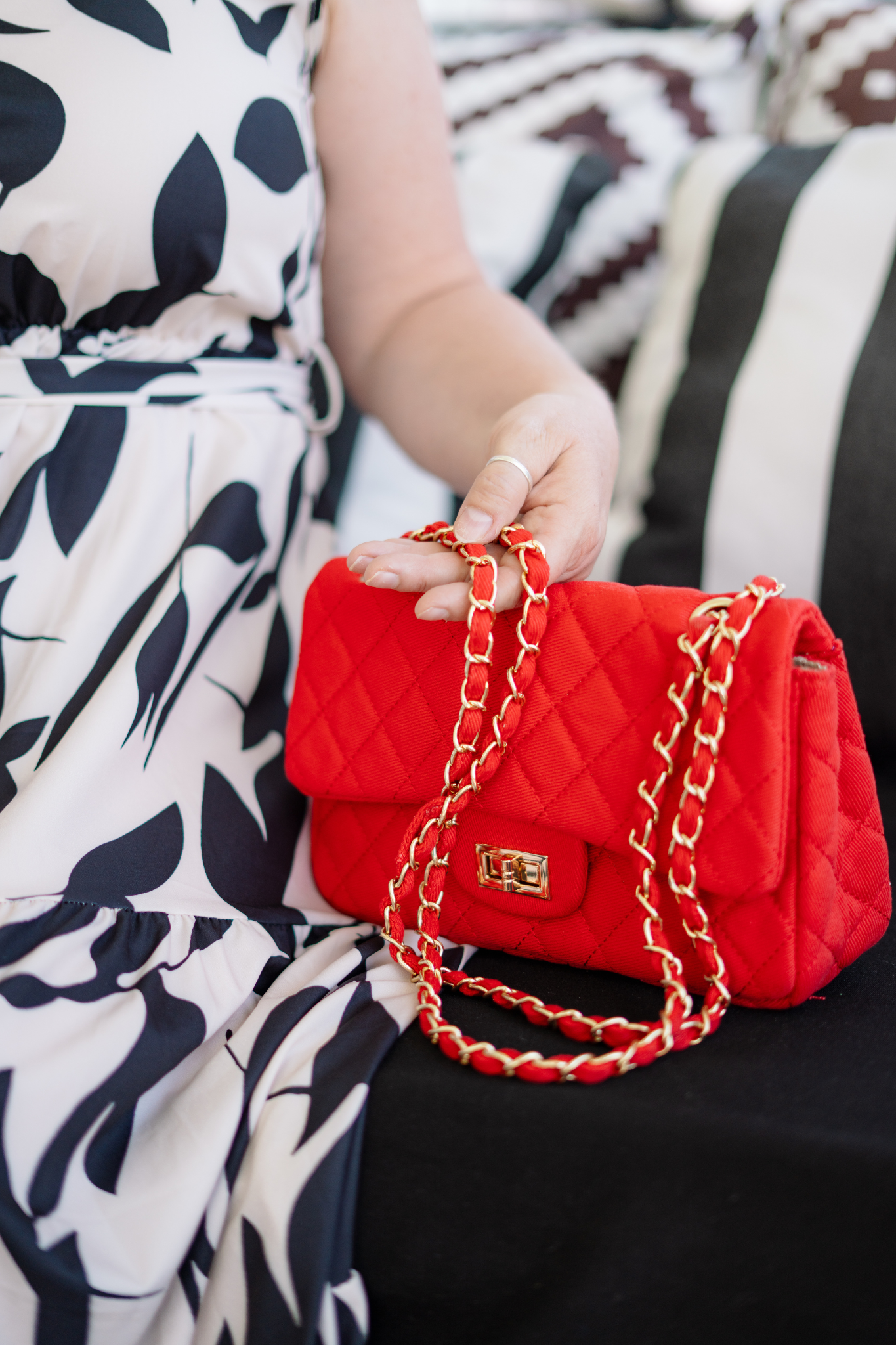 She was made for the runway of your life! Every woman needs a Sassy Statement Purse in her lineup. That bag that fits the need for fashion and function. She's that POP of color to our solid wardrobe and the ray of sunshine each time we pick her up. And she pulls double duty as a double handle shoulder bag or a single strap crossbody with a simple slip of the hand. Complete with gold hardware, exterior open back pocket, interior zip pocket and a classy twist lock clasp. Quilted Cotton Canvas exterior - Chain Shoulder Bag 10" W X 5.5"H X 3"D