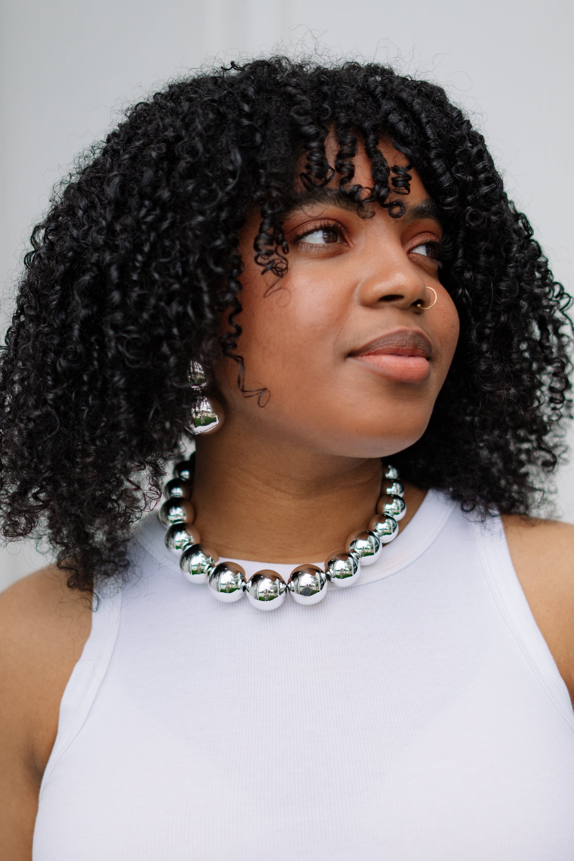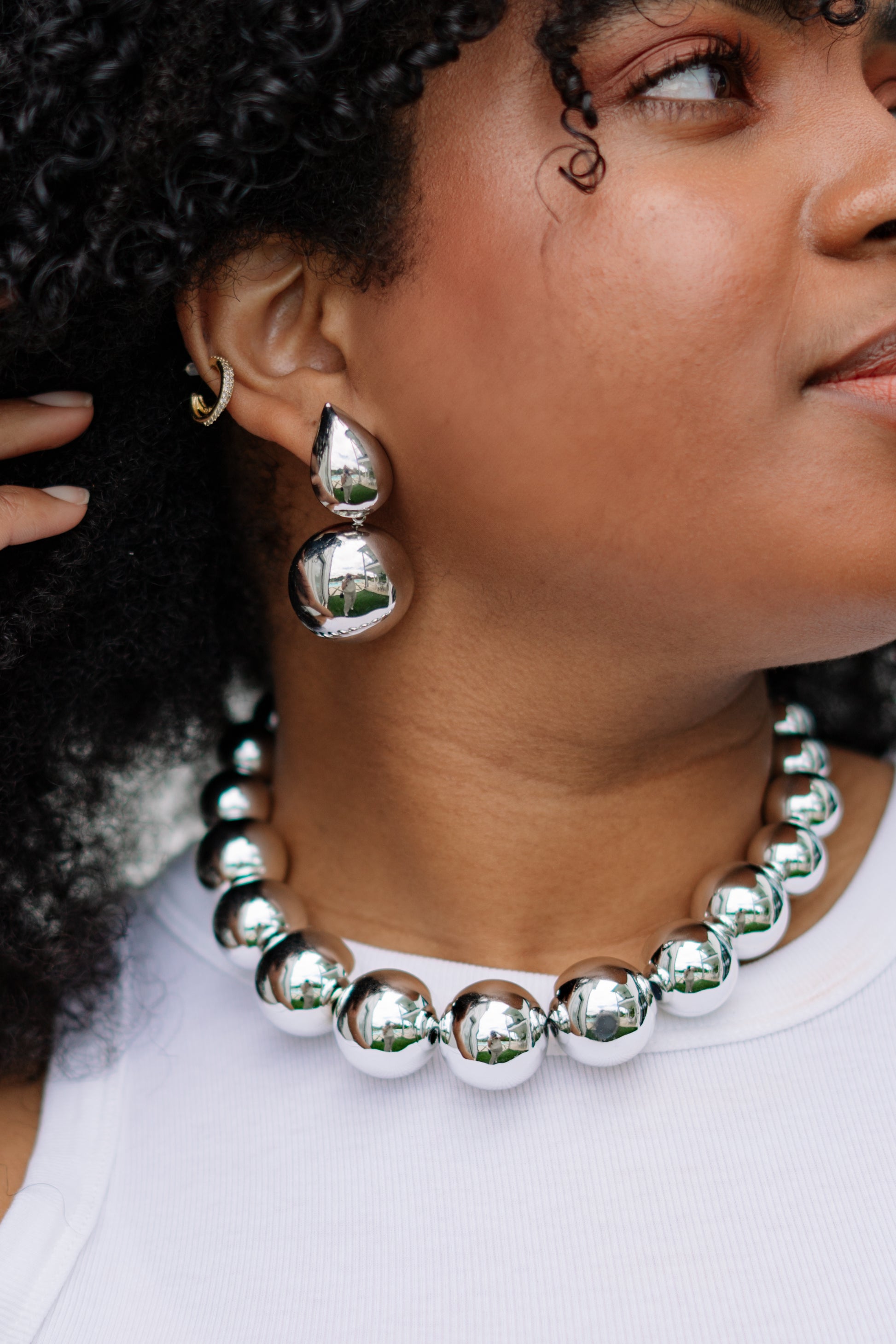 Coordinating Drop Earrings β Teardrop and orb shapes create a striking silhouette